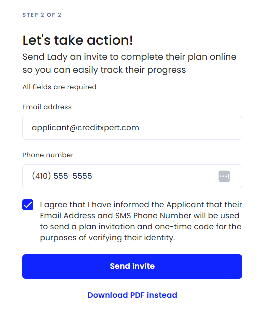 NOTE: If you intend for your applicant to log into CreditXpert to progress through their action items on the plan, please ensure that this phone number is a mobile phone number. This number will have an SMS text message with a verification code sent to them to log into CreditXpert and this verification code is required.