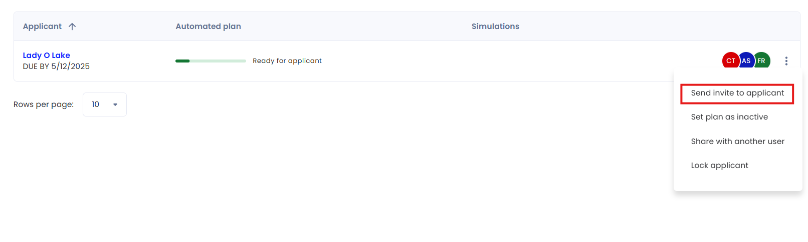 To update an applicant's email or mobile number, navigate to the applicant in the plans page and select the menu to the far right which displays the option to "Send invite to applicant":